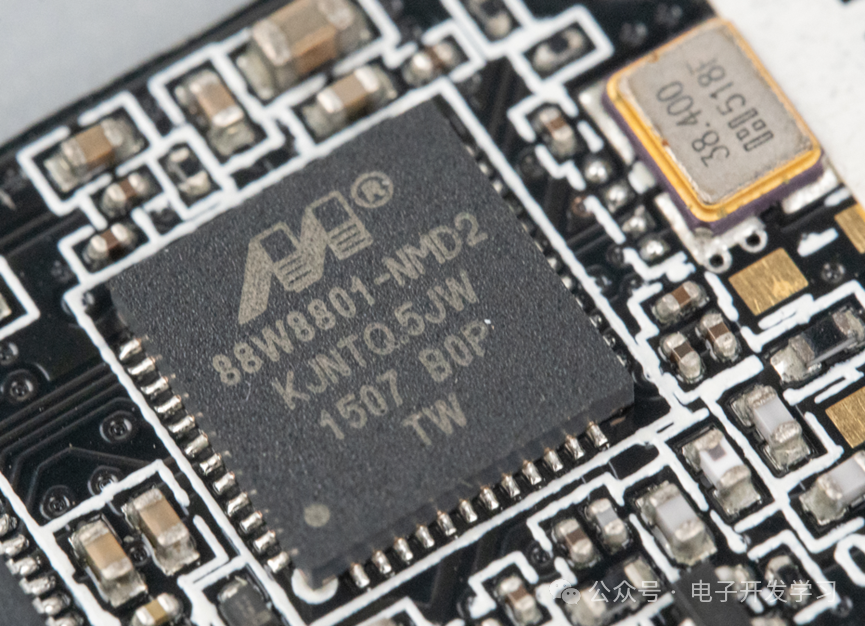 无线子板上,用的两颗芯片都是Marvell的。其中一个是88MC200是主控芯片。另一个88W8801是Wifi芯片。两个芯片配套的晶振分别是32MHz和38.4MHz的频率,封装都是3225。