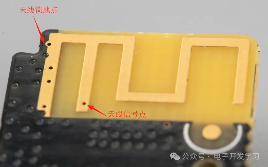整个板子是黑色油墨、焊盘沉金工艺,PCB天线处做了净空,金灿灿的天线看着很帅。