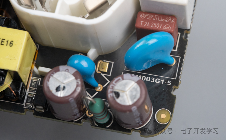 其中这个蓝色的压敏电阻,型号是10D471K,其中10D指直径10mm,471指电压470V,而K代表电压精度±10%。两颗输入电解电容是4.7uF400V。