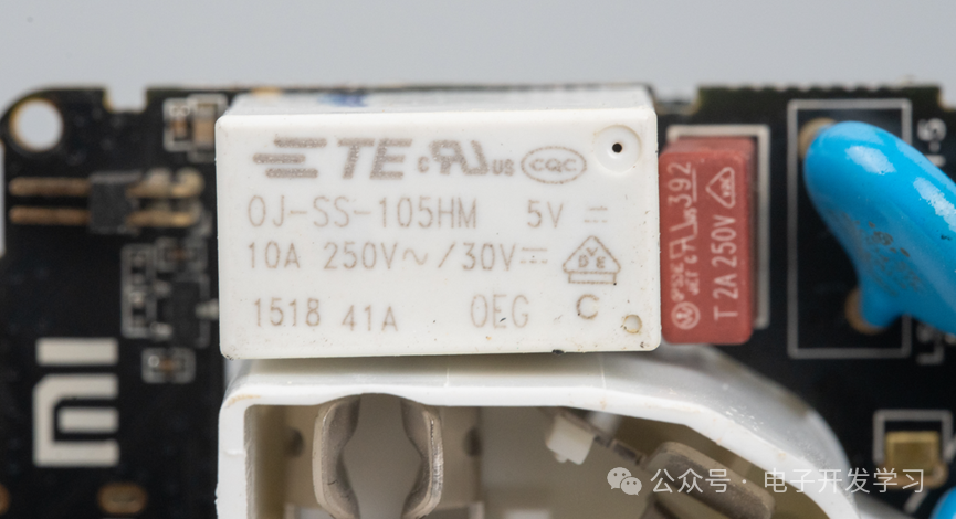 既然是一个智能插座,那么它最基本的功能就是给输出通断电。这个是由继电器实现的。板子上采用了TE的继电器,型号是OJ-SS-105HM,这是一个小型PCB通用功率继电器,触电的额定电流是10A。