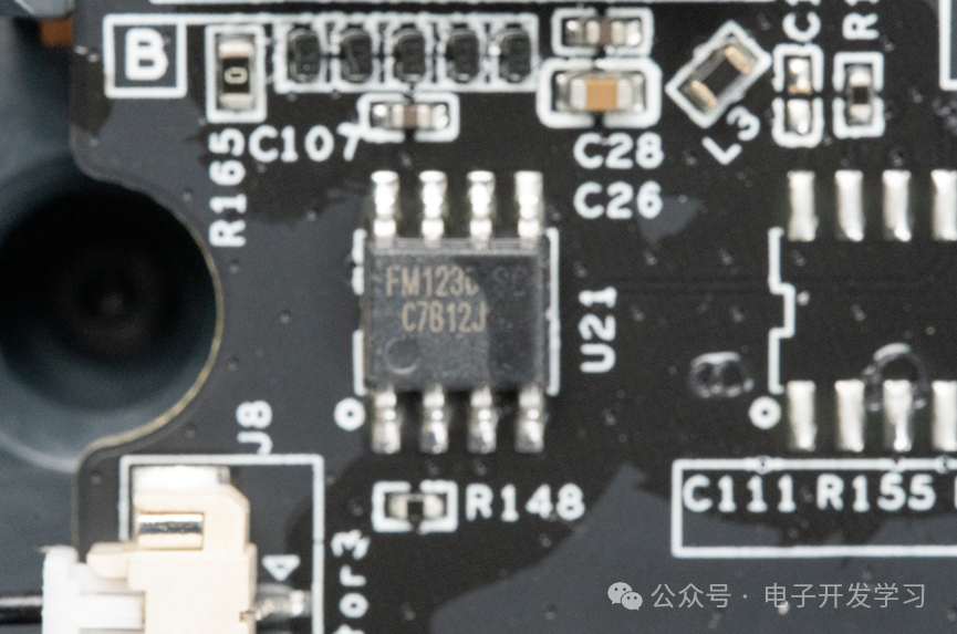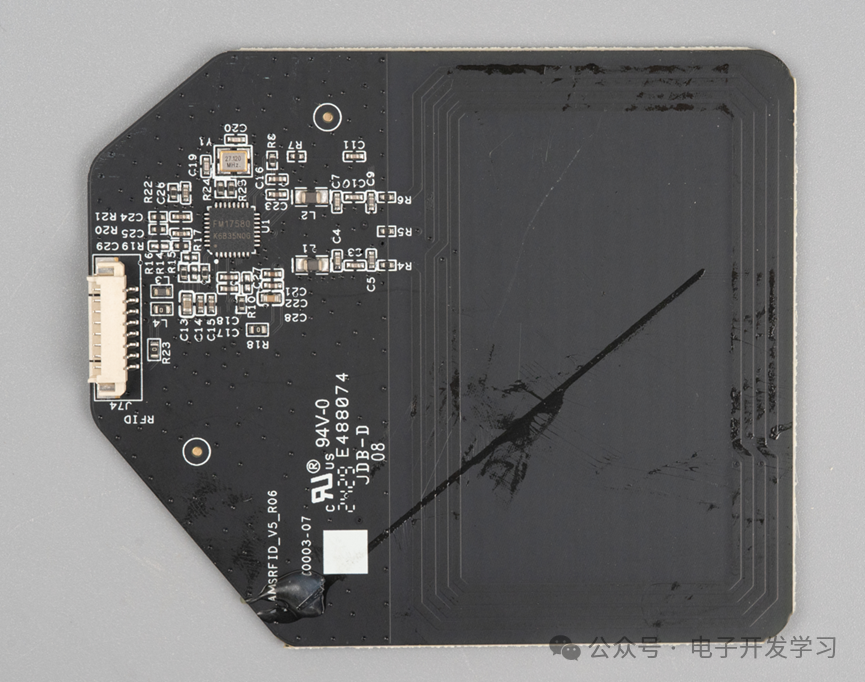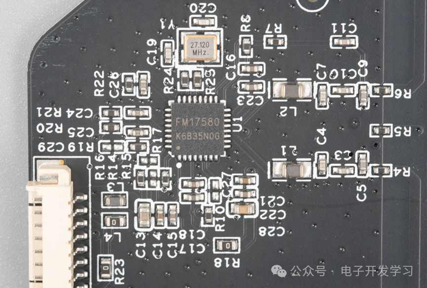 采用的NFC芯片是FM17580,这是来自复旦微的一款13.56MHz NFC读卡器芯片。支持14443 TypeA和TypeB读写器模式、支持M1加密、读写器操作距离可达50mm、支持通过SPI与主机通信。旁边的晶振是27.12MHz,其实一看到这个晶振,就知道这是NFC芯片。