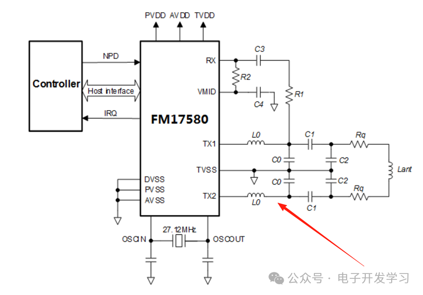 这是FM17580的典型电路图,其实NFC的电路比较特殊,它的天线是一个封闭的线圈,从芯片出来有两个电感、还有一坨阻抗匹配的电容电阻等等,晶振27.12MHz,所以在电路板上比较容易识别。