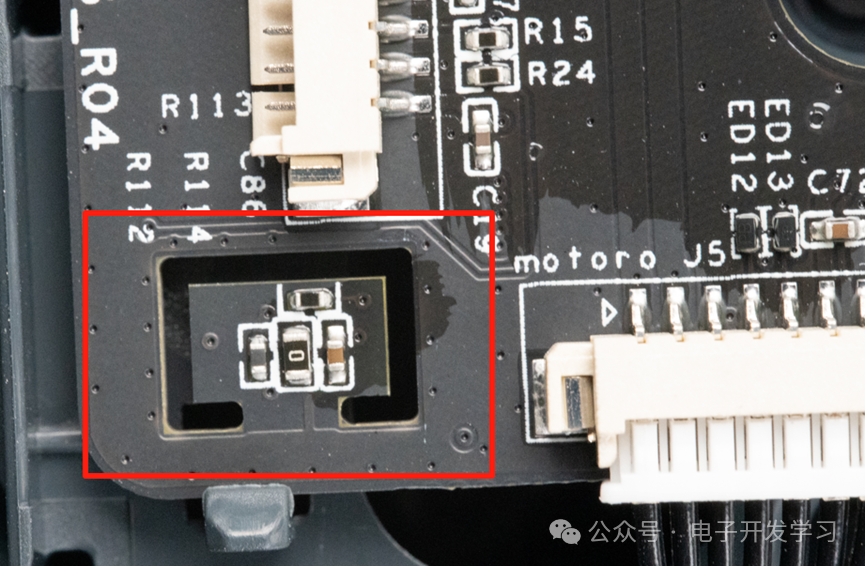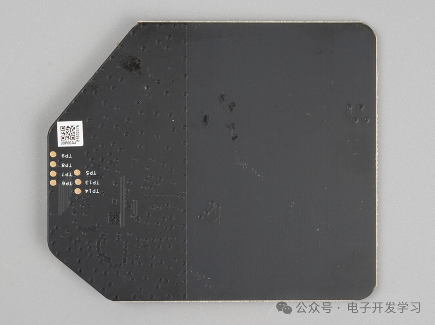 在板子的一角可以看到一个周围挖槽的区域,看来这个位置背面放的应该是温度敏感或者震动敏感的器件。