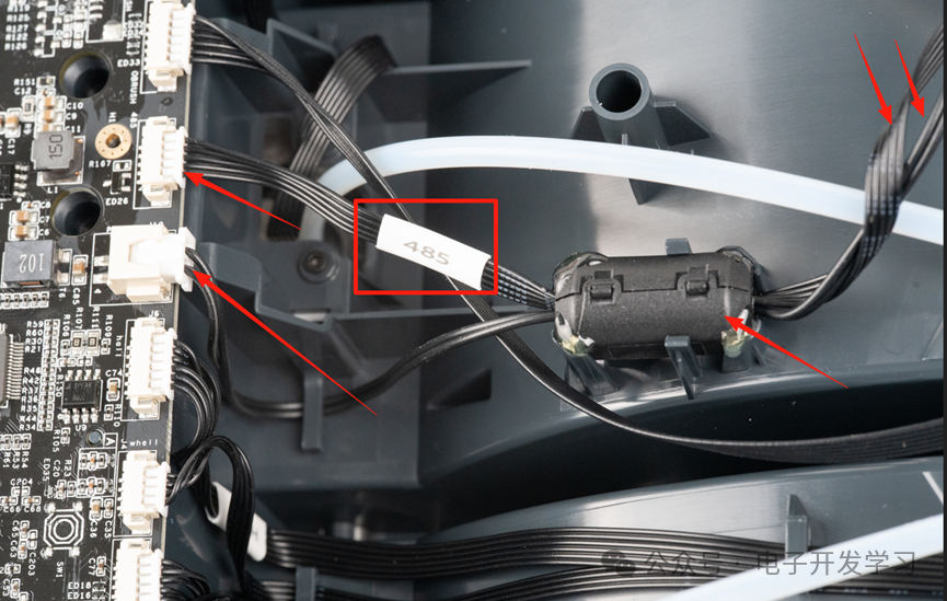 主板输入有两根排线,2P的这个是供电。5P的是RS485通信线,线束上加了一个磁环。为啥这个RS485是五根线,结合板子上正面背面各有一个RS485收发器,我猜测这是为了级联用的。因为这个ASM最多可以扩展16个耗材位,而打印机上只有一个接口,所以其他的应该是通过RS485扩展的。