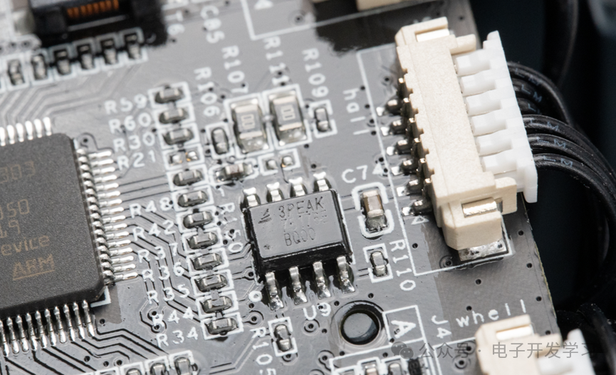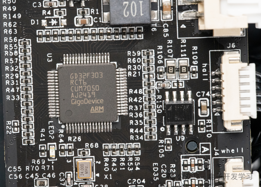 主板上,主控芯片用的是GD32F303RCT6,来自兆易创新的ARM-M4内核的MCU,主频120MHz,封装LQFP-64。这个器件的参数性能应该比较接近STM32F405RGT6(主频168MHz),但是价格只有STM32F405RGT6的三分之一多一点。