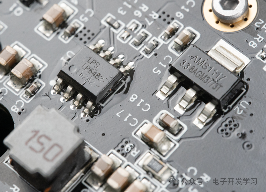 DC-DC芯片是微源半导体的LP6482,这是一个340KHz、2A电流的带软启动的降压转换器。旁边用了一颗AMS1117用来实现降压稳压。