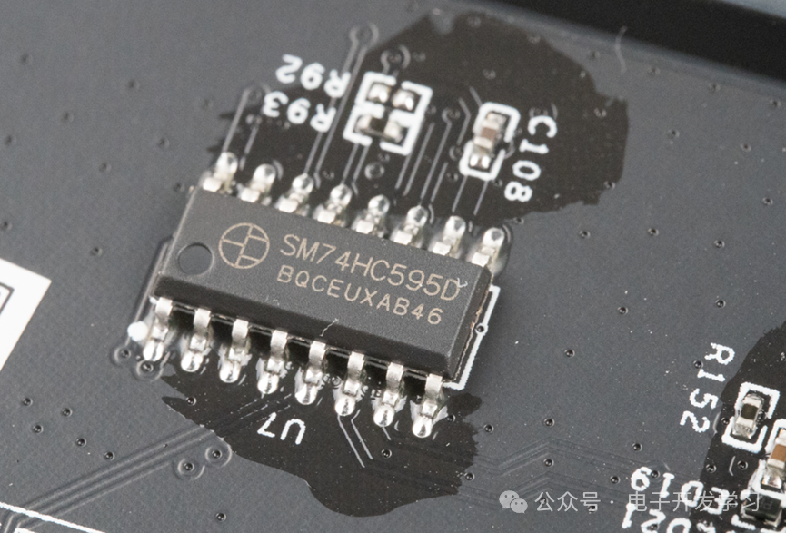 板子上用了一颗明微的移位寄存器SM74HC595D,这芯片我查了一下价格非常便宜,甚至做到2毛以内了,是Ti对标产品价格的一半左右,这是我第一次见到的厂商和型号,国产芯片是真牛啊。
