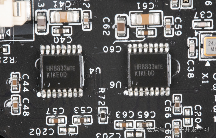 板子上还有两颗HR8833,来自嘉兴禾润的电机驱动芯片,封装为ETSSOP-16。这又是我第一次见到的厂商和型号。