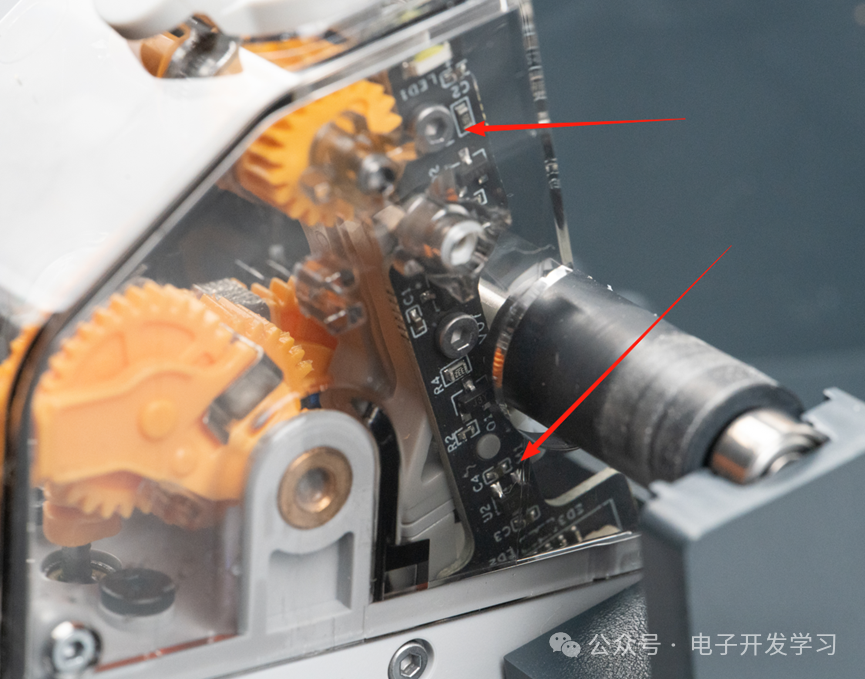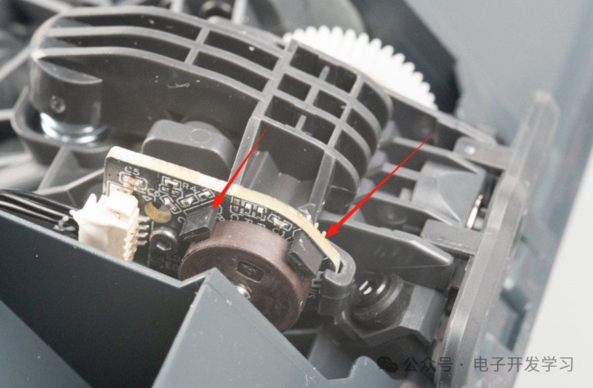 很显然在耗材挤出的齿轮上挂了一个霍尔编码器,用来读取耗材挤出速度,最终精确控制挤出速度。