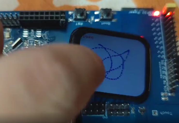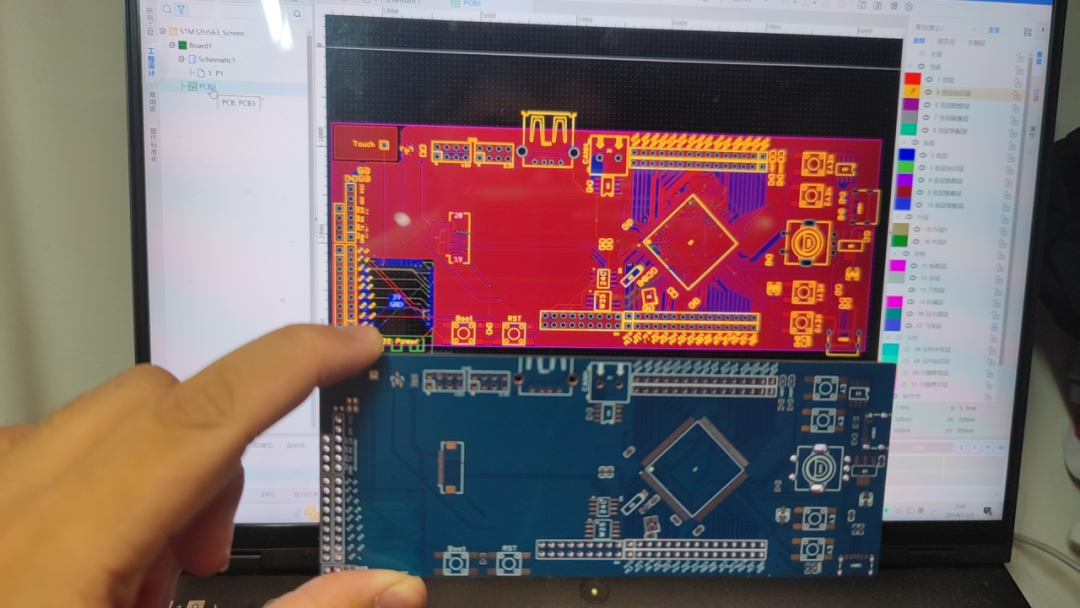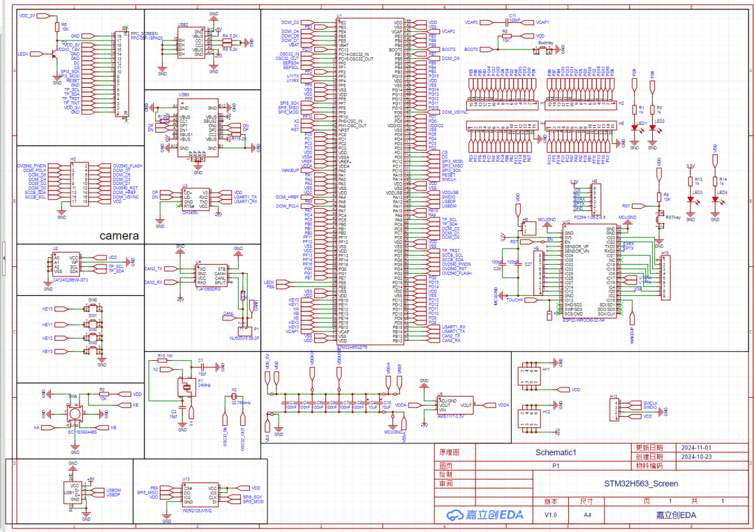 用户输入除了触摸屏以外,还留出了四个轻触按键以及一个编码器旋钮。编码器旋钮具有实现正转反转识别以及按下识别的功能,扩展性比较多,不过后期可能将这个编码器开关换掉。除此之外,电路中还添加了一个CH340串口,CAN总线接口以及USB接口。H563还为其配置了AT24C256和W25Q128,提供了高达128K的EEPROM以及16MB的外部FLASH,这为之后的GUI部署提供外部FLASH用以存放图片数据,不过由于还在测试版,所以肯定还是有非常多的BUG和修改的地方。