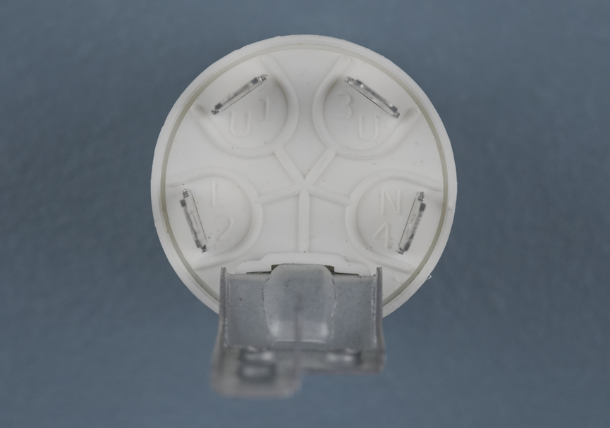四个触点,其中L和N是220V交流电输入,两个U是输出。下面这个大铁片起两个作用,一个是使用螺丝固定整个滤波器,第二个作用是接地。