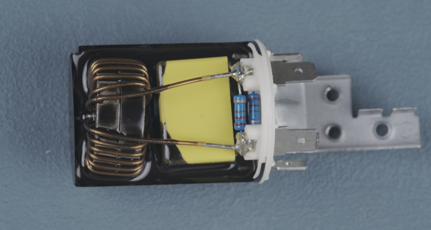 给来个特写,从这个标签上来看,这里面也就是一个2x2mH的共模滤波器,一个1uf的X2安规电容,两个27nF的Y2安规电容。另外是一个1.2M的电阻。