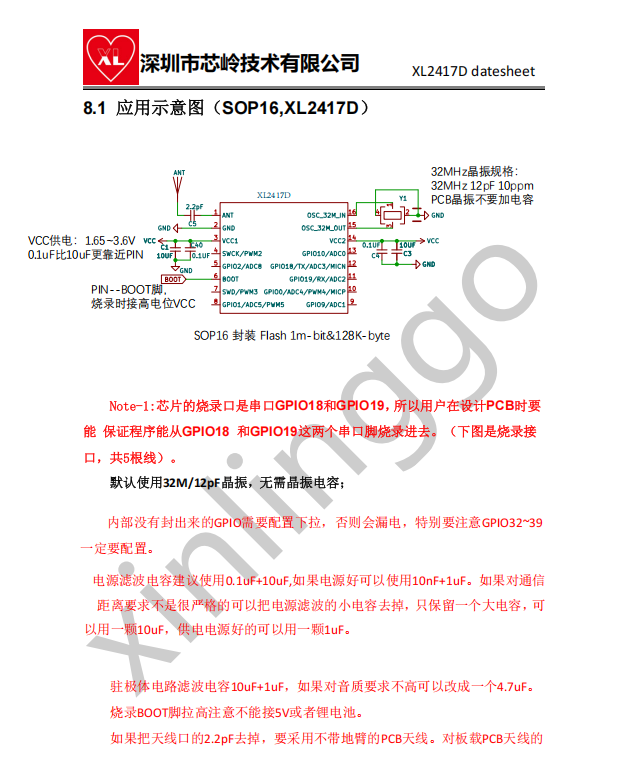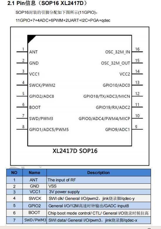 XL2417D芯片是一款低功耗、高性能和高度集成的SoC,带有2.4G收发器。它集成了高性能2.4GHz射频收发器、丰富的基带功能、32位MCU和各种外围IO。