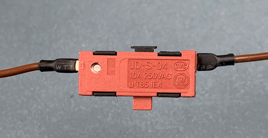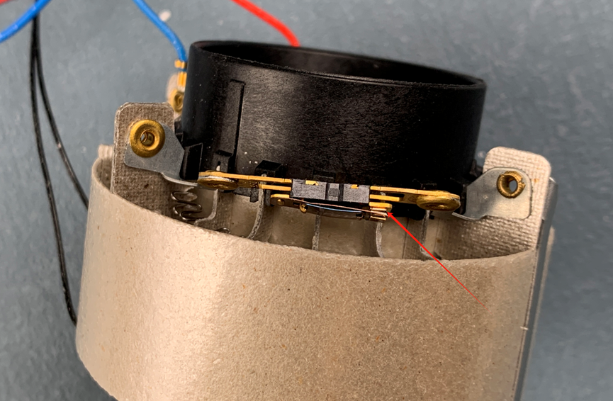 背面有一个过温保护开关,我看原理应该是类似温度记忆金属之类的方式实现的,当温度过高的时候,下面这个金属片变形导致触点分离,加热丝断电,温度恢复之后,金属片恢复记忆形状,触点吸合,加热丝导通。不得不说,这个吹风机的保护机制做的是真好。另外提一嘴。一些厨房油烟机排气管上安装的防火止回阀上也有这种温度记忆金属的组件。