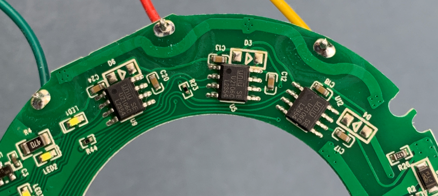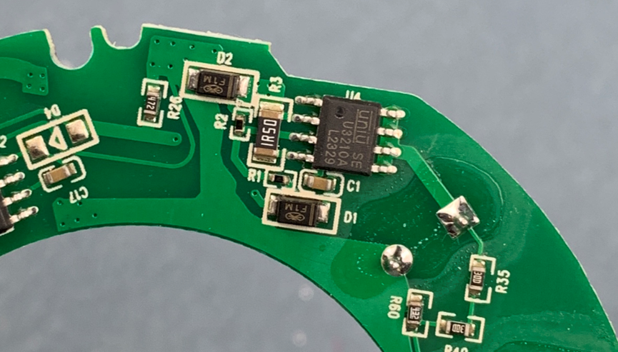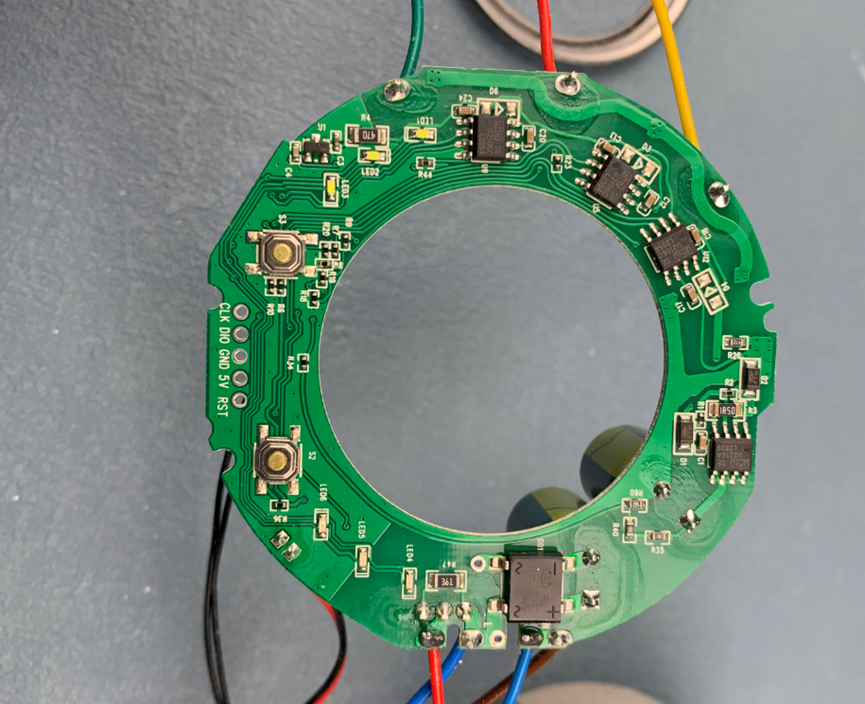 电路板:整个电路板是一个环形的PCB板。外径约68mm,内部圆孔的直径为40mm。PCB层叠只有两层,绿油白字。