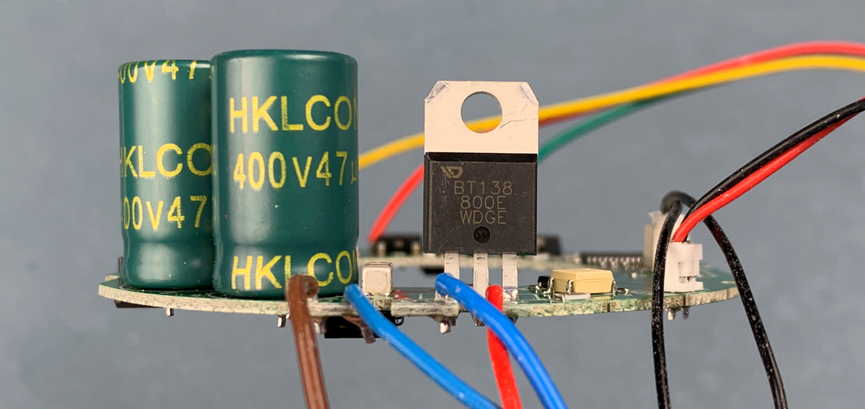 电热丝加热需要使用晶闸管控制,这个晶闸管的型号是BT138-800E,封装TO-220B,来自江苏韦达半导体。这个晶闸管的持续导通电流是12A。