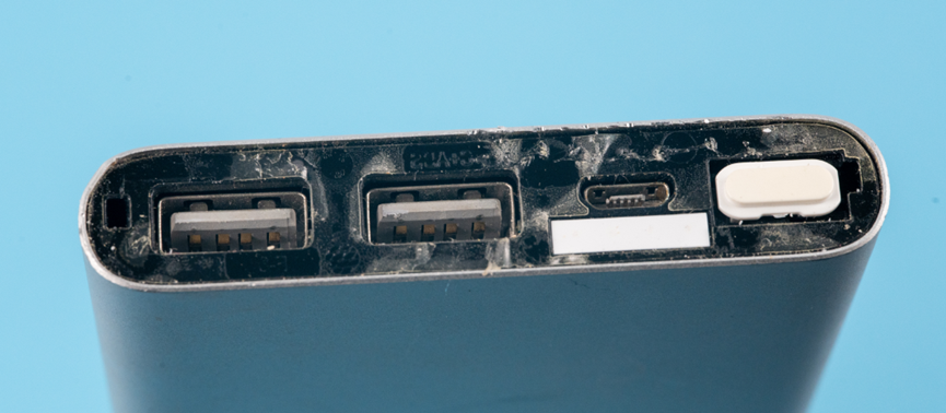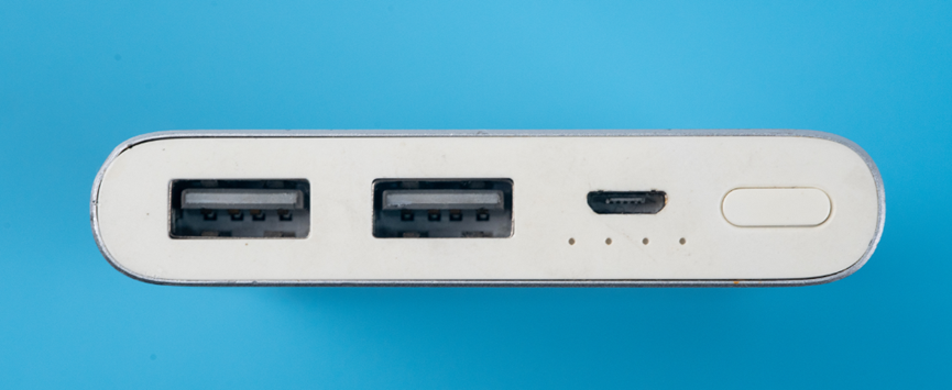 接口很明确,两个USBA口是对外放电的,可以用来给手机等其他充电设备充电。而Micro USB口则是给充电宝充电的接口。Micro USB口下面有四个LED灯。在充电时动态显示充电过程以及电量。最右边是按键。