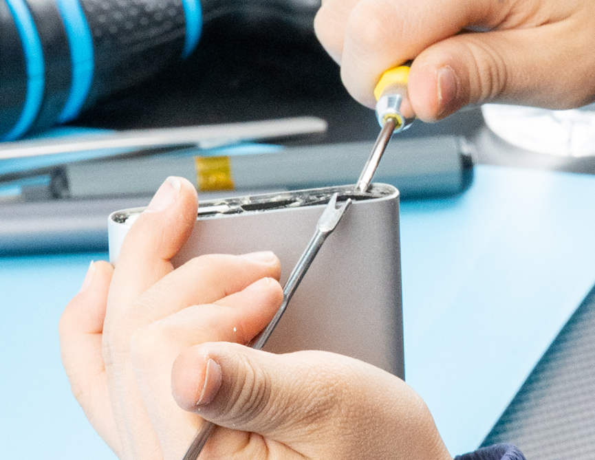 外壳是铝合金的,两端都是塑料的,整个外壳上看不到一颗螺丝。对于这种产品,想拆解只能暴力下手了。撬掉外面的塑料壳,看到是用双面胶粘在里面黑色的支架上的。