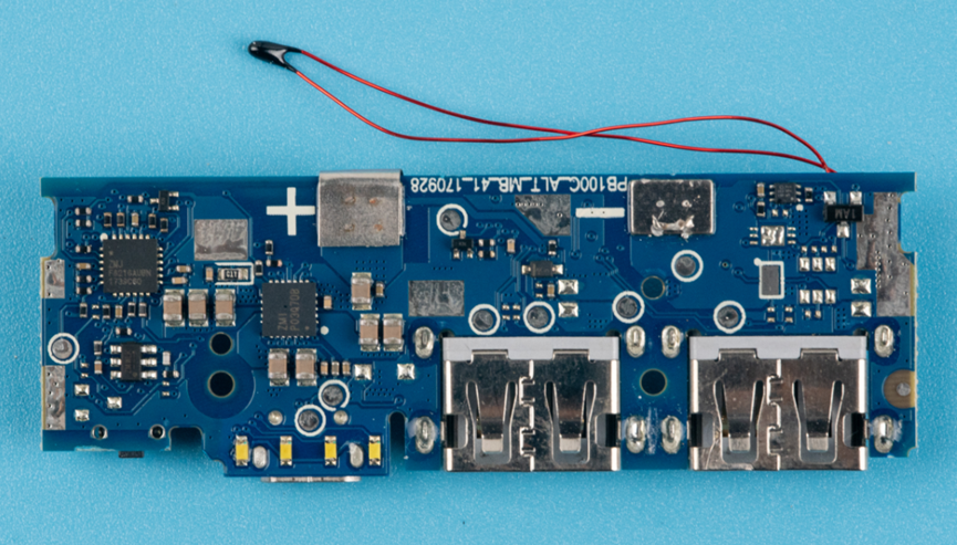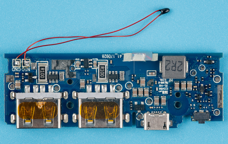 电路板上用两根漆包线接了一个NTC负温度热敏电阻,热敏电阻贴在锂电池包上,用来检测电池包的温度。板子这一面有两个100mΩ的采样电阻,用来检测给外设充电的电流。