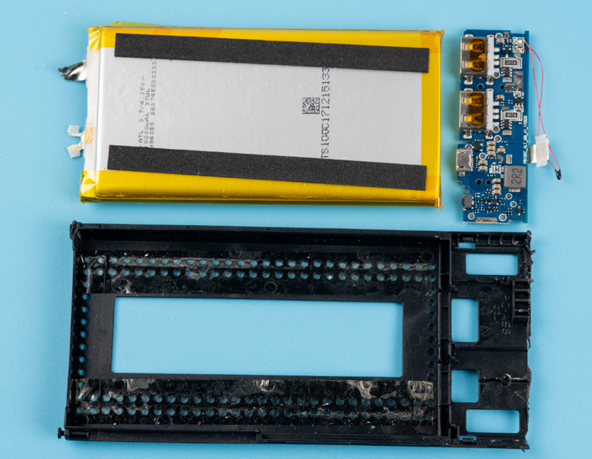 这是这个充电宝除外壳之外的全部零件。我感觉我拆了个寂寞,上面的关键器件我一个都不认识。不过这也从侧面说明了一点,这个系列的充电宝的销量足够大。值得定制丝印或者针对它研发专用芯片,这样利润得以进一步增加。