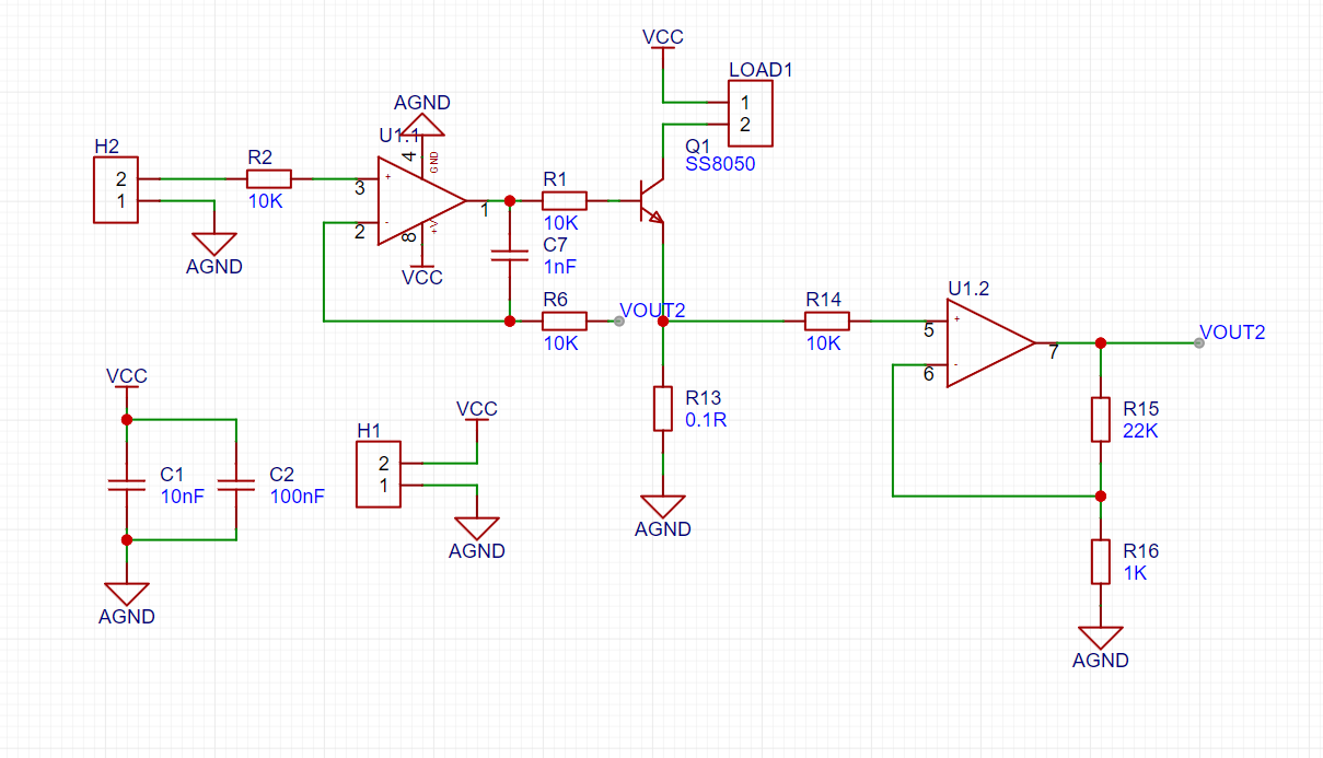 设计一个输出最高1.4A的一个可控恒利源,其中H2的正极为DAC的输入口,通过LM358运放的虚短,虚短来设计的恒流源,VCC输入为5V,根据手册运放的输出端最大为VCC-1.5左右,按照3.5V的最大输出来设计,R13为采样电阻,考虑到电阻的功率问题,选择了比较小的电阻,0.1R/1W,我的DAC输入范围为0-5V,所以需要运放放大,达到可以调节的目的,当通过最大电流为1.4A时,采样电压为0.14V,放大23倍,为3.22V。以上为理论设计。 实际测试遇到的问题,使用6颗0.5W的5730LED并联测试(单个LED最大电流为150ma),当一级运放正向输入端为3.5V时,最大电流上不去,反馈采样电压最大就只能达到0.0913V,计算出电流大概是800ma左右,一级运放反向输入端为2.1V,实际上,正向输入端大于2.1V的时候,运放已经不会在继续调节了,脱离了虚短,虚断的范围。