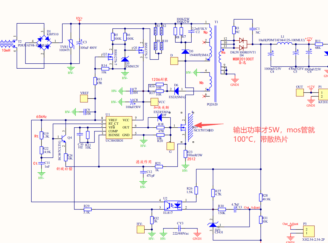 原理图如下 采用UC3843做驱动,已更换了4款mos管,发现都有温度过高的情况。变压器参数下文会给出。相关MOS管测温情况也给出。
