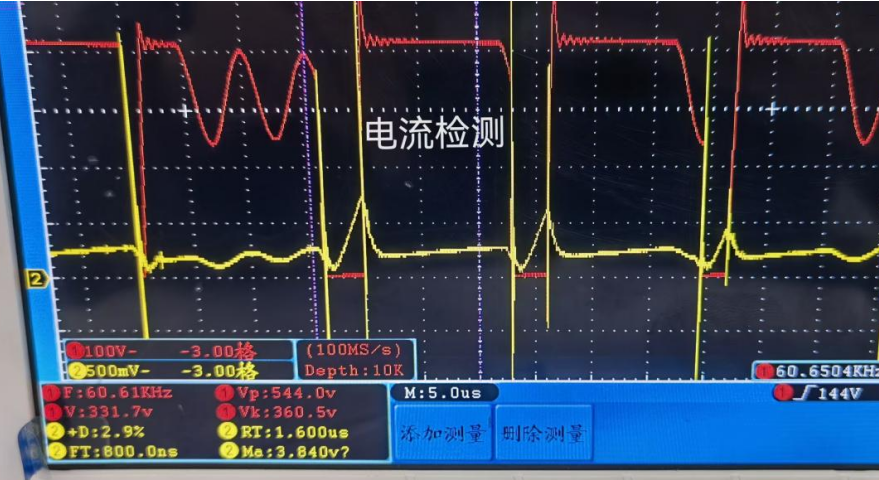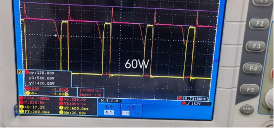 电路各部分波形正常,工作在DCM模式,VDS(红色)+VGS(黄色)