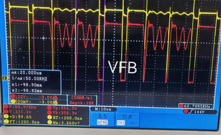 测FB脚信号2.5V(黄色波形),CS电流检测在0.5-0.6V.