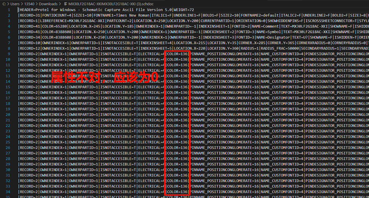 用文本编辑器打开导出的文件,发现COLOR属性不对,应该为0实际却是136,改成0再从ad打开颜色就对了,说明导出的ad文件没有按照EDA中主题设置的颜色来,目前就发现引脚颜色设置为黑色(#000000)时有问题,其他属性及颜色暂未发现问题