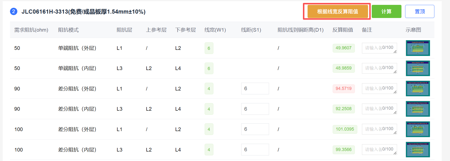 嘉立创阻抗计算,同样的线宽线距,点击根据线宽反算阻抗,为什么计算的结果不同(90R、100R)
