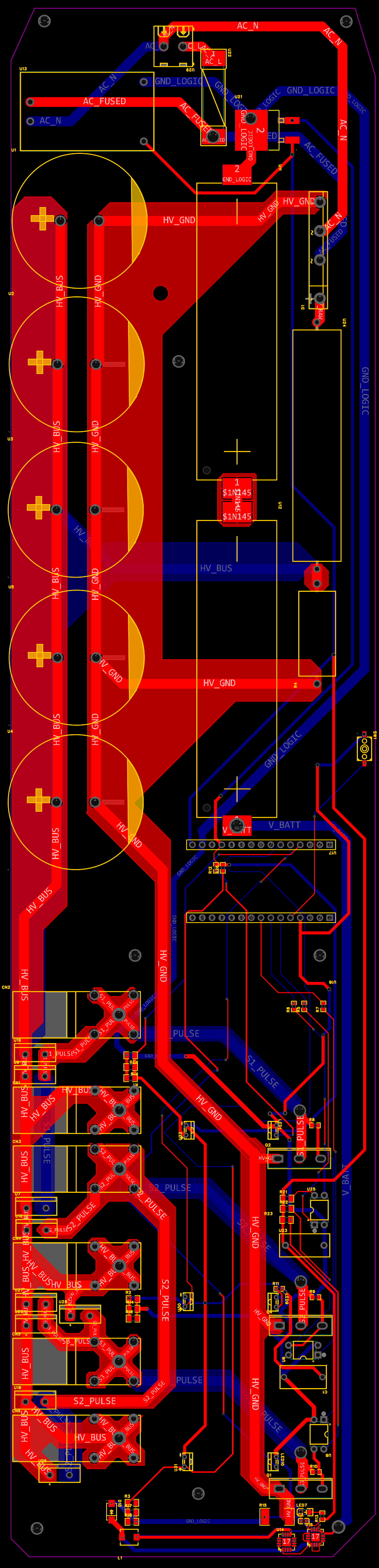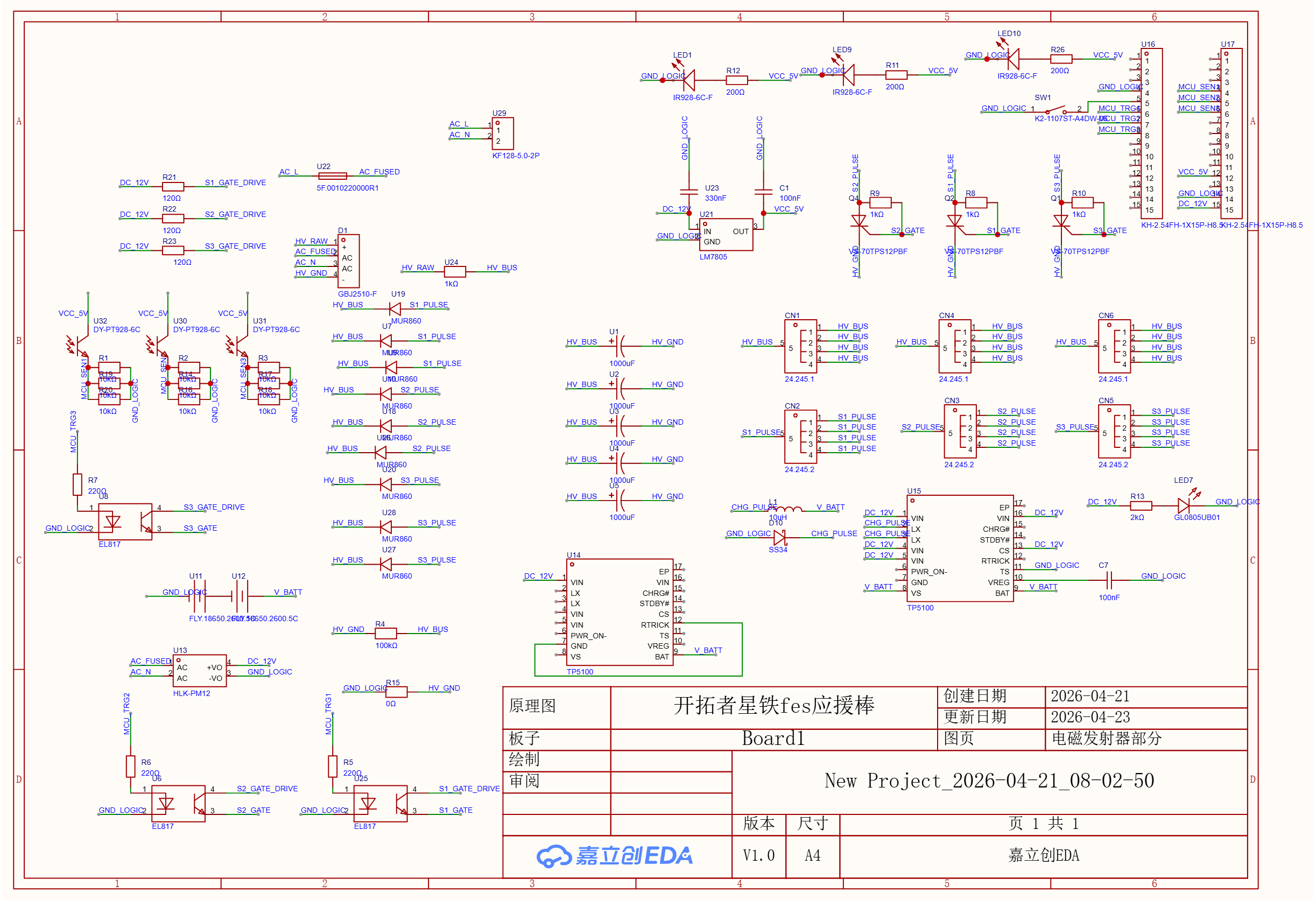 大家好,希望能帮我审查一下这张原理图,因为之后再根据实物修改会比较麻烦。图里的 U16 和 U17 连接的是 Arduino Nano V3 开发板。项目是一个功率控制模块,预期功能是:使用标准电源接口充电,通过笔记本电脑连接 Arduino Nano 来调试控制时序,同时记录运行数据。模块的设计目标是提供 20J 左右的能量输出,线圈部分采用内径 7.2mm 的环氧玻纤管,壁厚 0.8mm,使用 1mm 铜漆包线绕制,分为 3 段,每段长 25mm(约 25 匝),铁芯使用了 7mm 直径、25mm 长的电工软铁,头部做了钝化处理。麻烦大家帮忙看看电路部分有没有问题,谢谢!