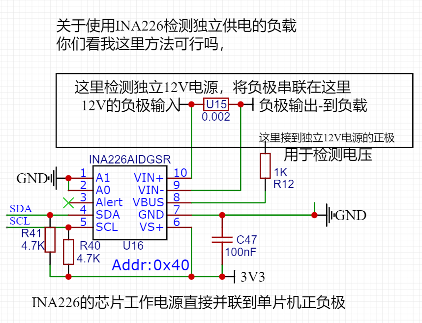 请教,单片机配合INA226检测独立供电12V的负载电流,这样可以吗?