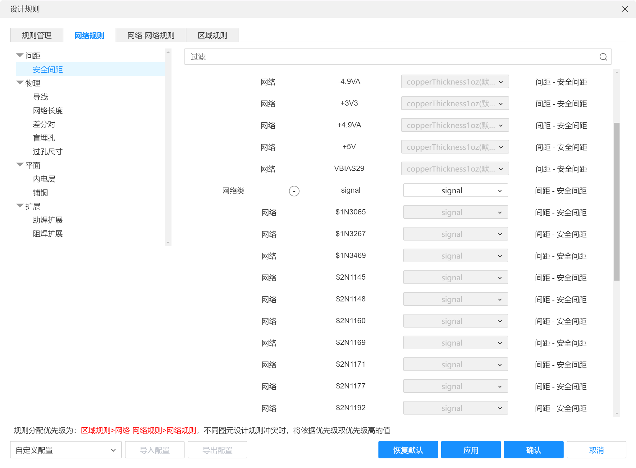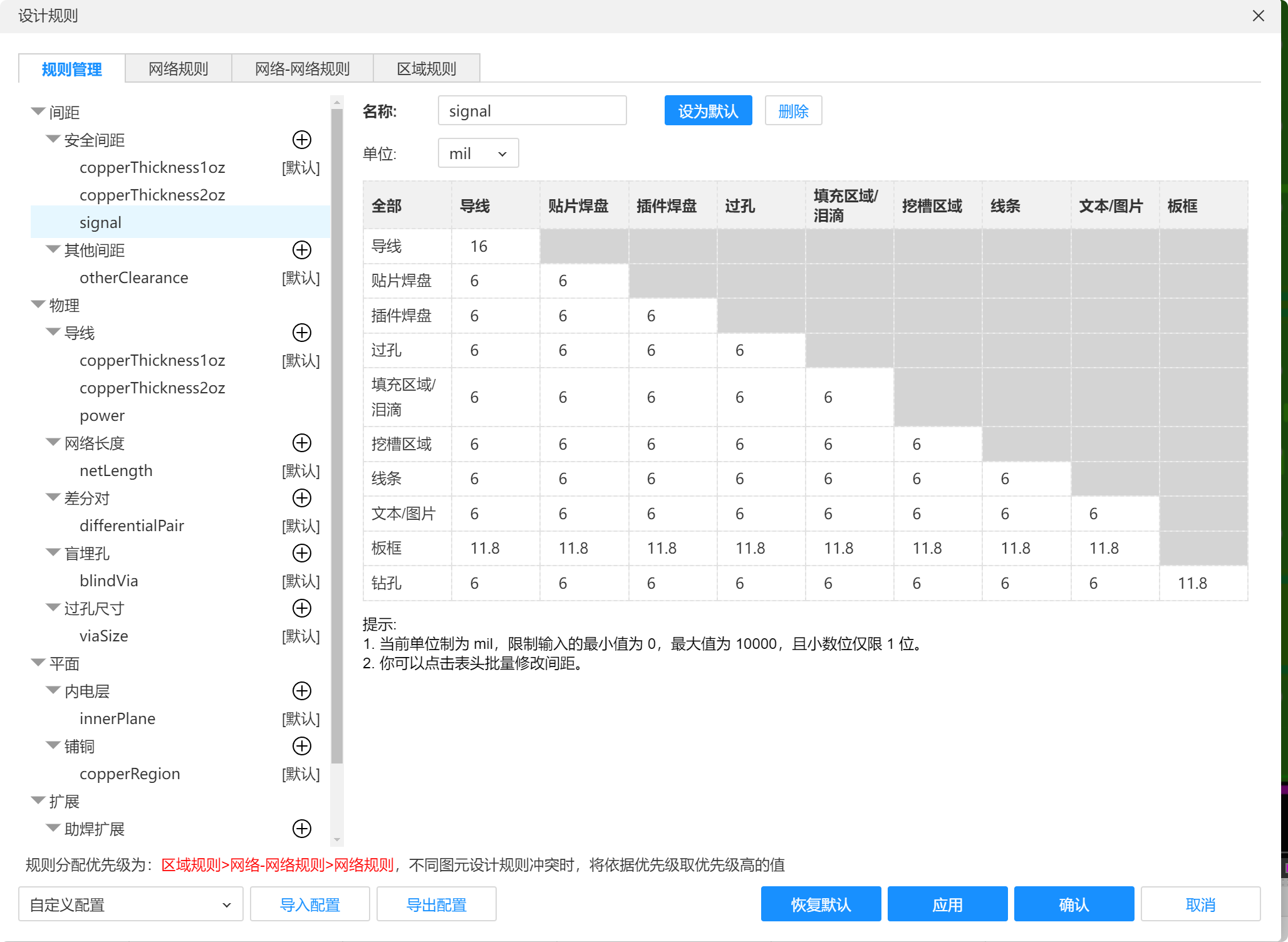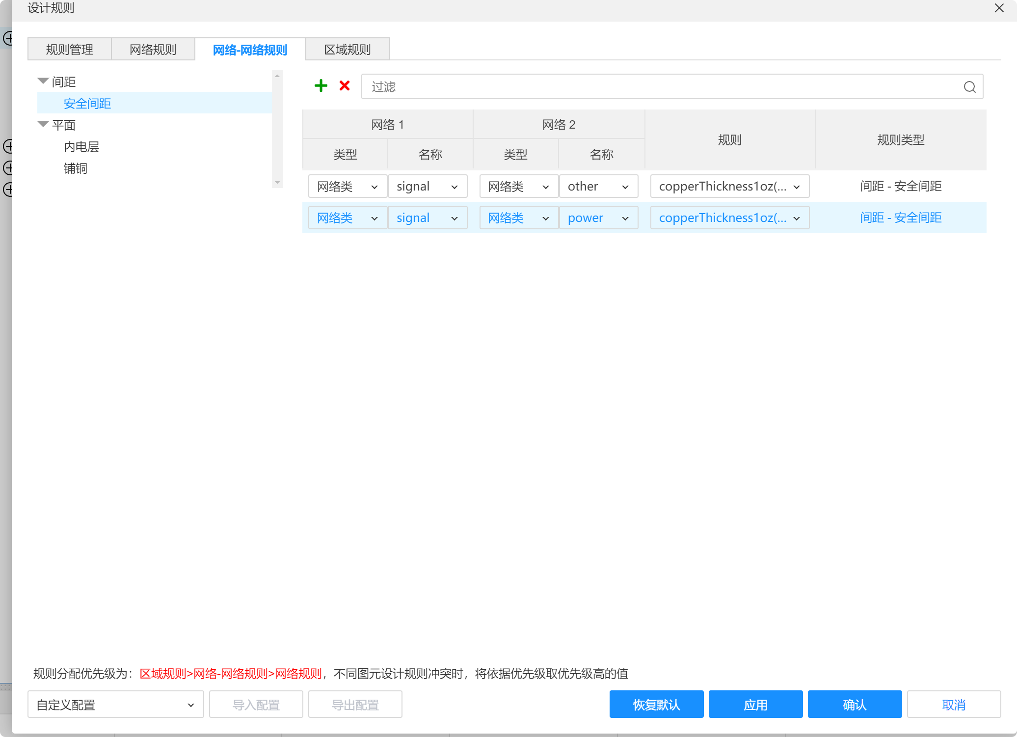 如题,在立创eda专业版中,我设置了网络类,比如 other、power、signal。我希望signal与signal之间的间距规则采用我设置的“signal规则”,而signal与别的网络类的间距采用默认规则。
