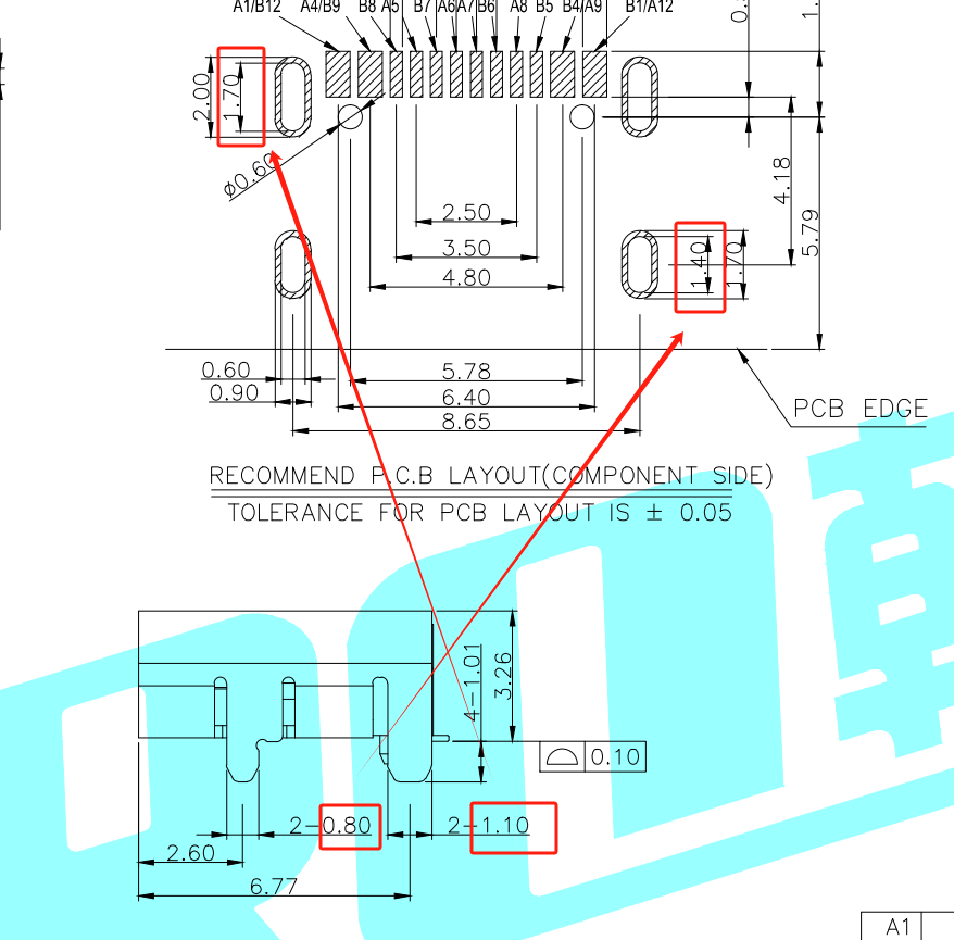如图是一个卧贴Type-C底座,它有2对定位插脚 实际尺寸分别是