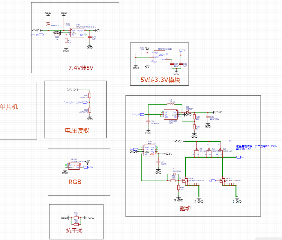 我使用单片机驱动电磁铁,电源是7.4V倍率电池,LDO降压给单片机供电,DCDC升压给驱动芯片供电,保证栅极驱动电压12V。 负载的电磁铁也加了续流二极管。MOS管过流能力很强,过去测试时也不发热。