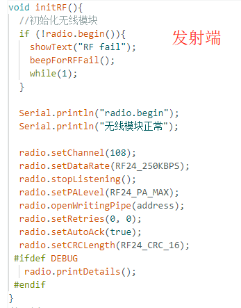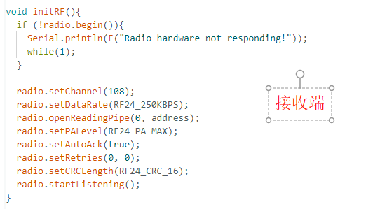 - 代码中radio.write始终都返回false,看arduino RF24库说明,是因为没有接收到接收端返回的ACK数据。