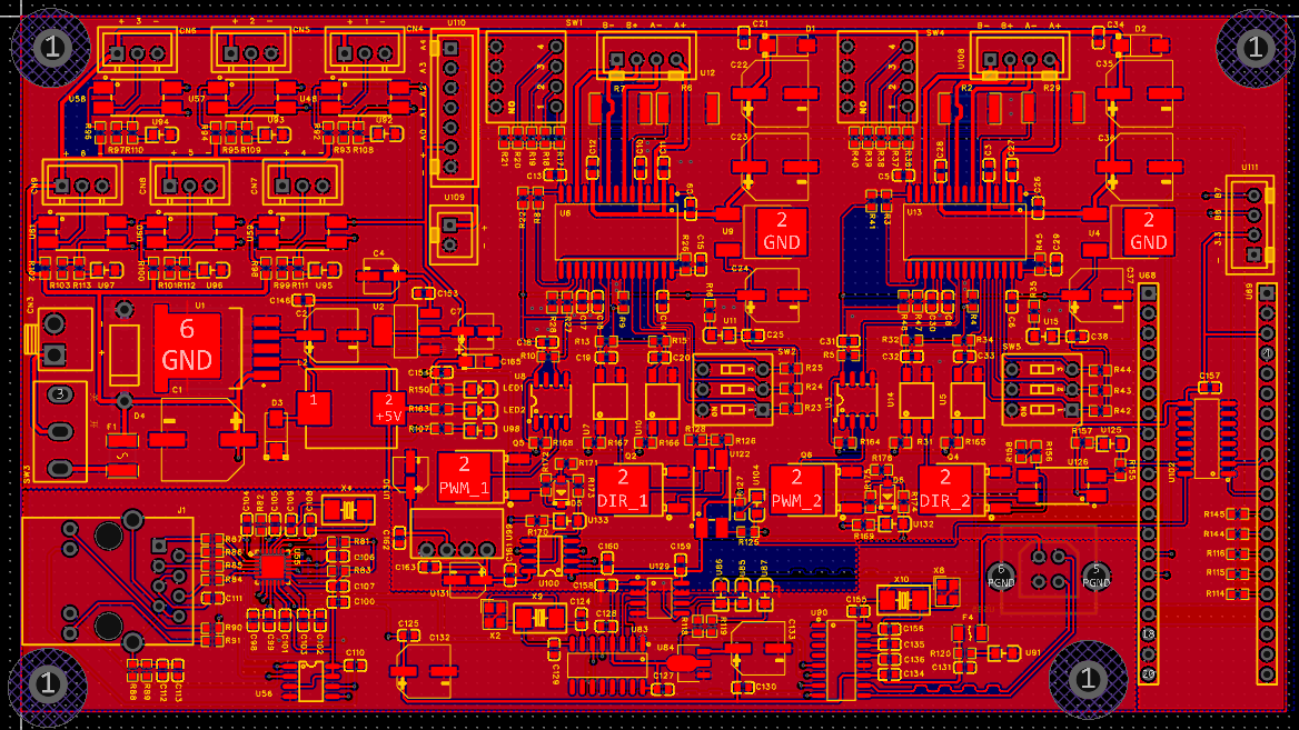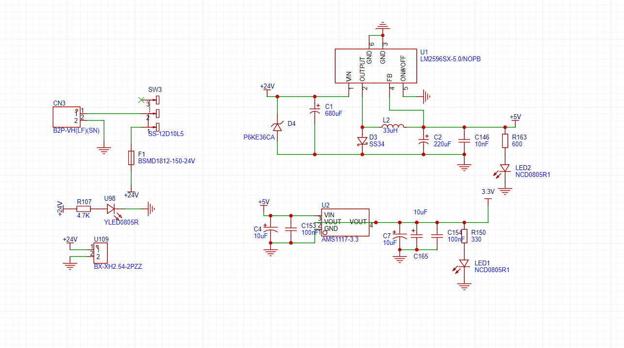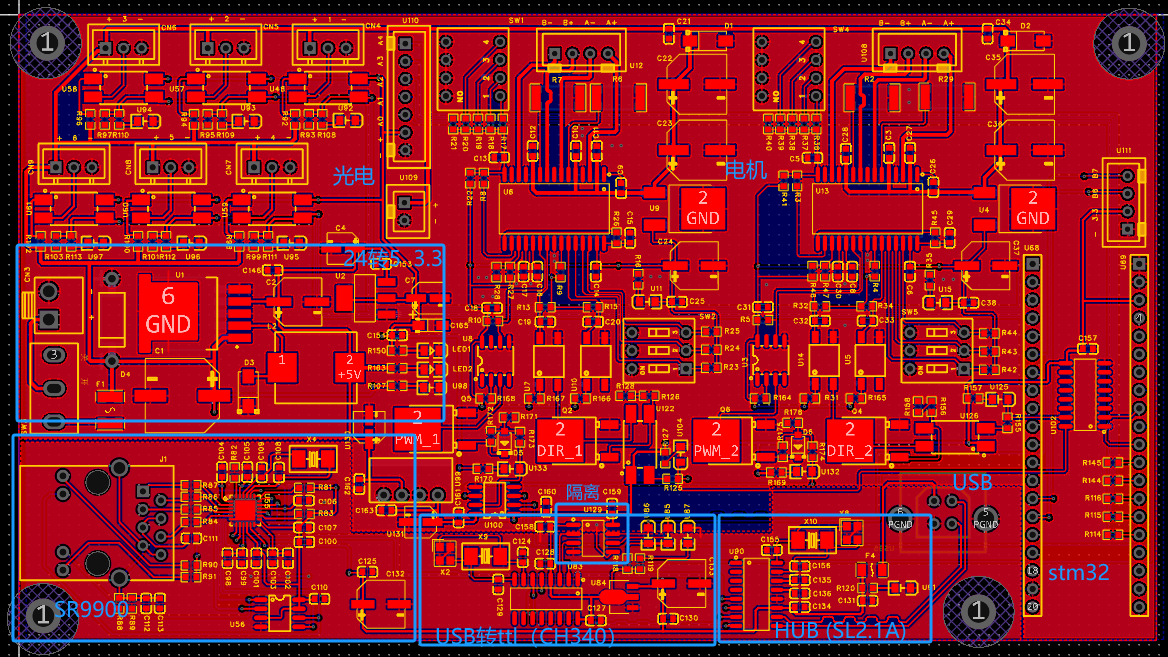 电路板为双层板,一部分为24v转5v,5v转3.3v,连接stm32f103,光电,电机驱动,