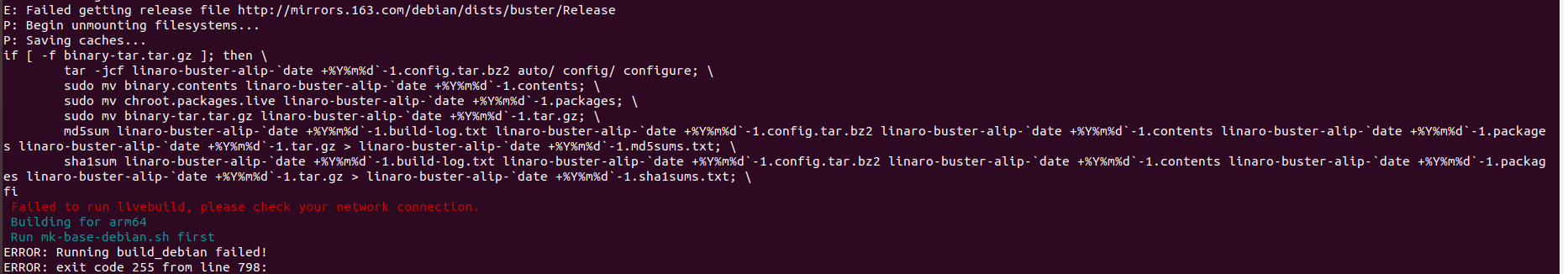 我根据哔哩哔哩中嘉立创训练营的官方视频进行学习,使用的是2+16版本,吴工视频中没有全编译。我在Ubantu18.04下一步一步安装环境后进行编译buildroot成功,但是编译debian过程中失败,该问题网上没有找到解决方法,已经困扰我三四天了。报错如下所示: