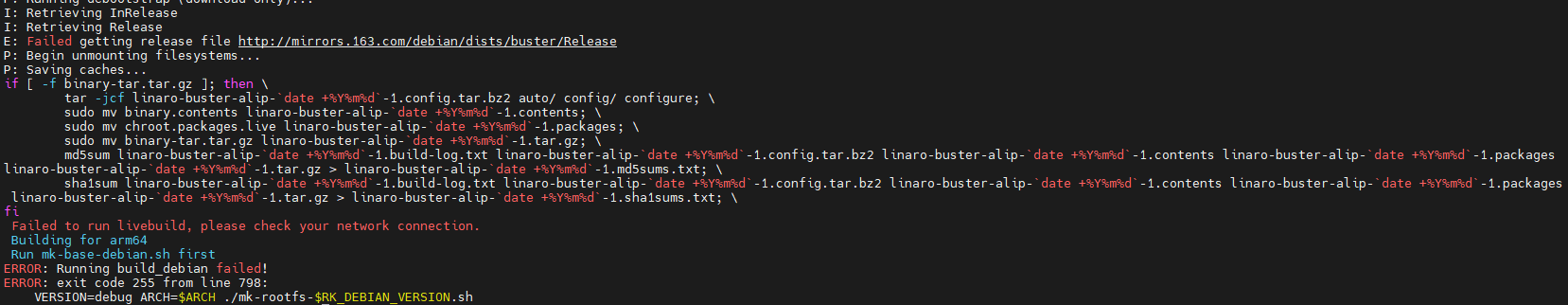 1.根据泰山派胖妞手机的文档教程,已切换网易镜像源。 2.检查网络连接,能ping通该镜像源。 3.我一直是裸机编译,创建docker后报错仍然相同。 4.切换镜像源后仍然失败http://archive.debian.org/debian/ 5.新建虚拟机后报错相同