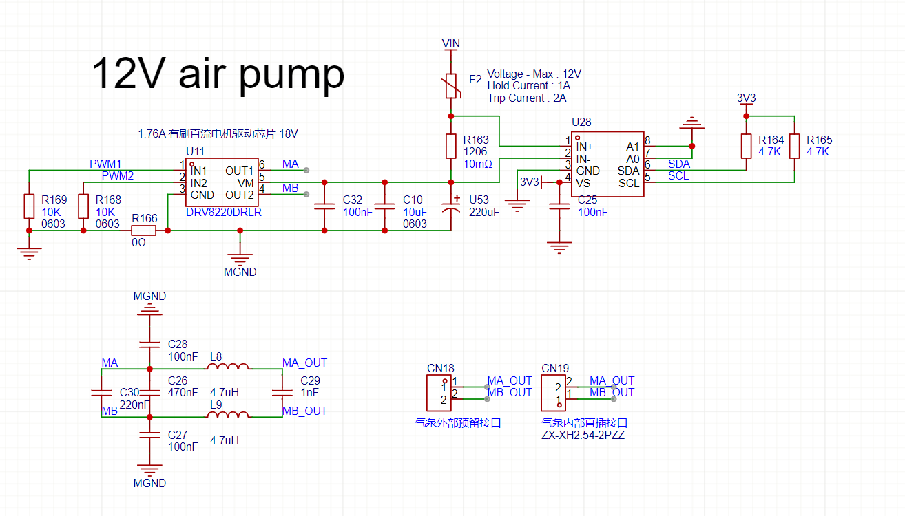 有没有佬能帮忙看看,我这有一个ESP32驱动一个12V,4W的小气泵,现在不知道为啥 用手频繁堵住气泵出气口的情况下ESP32的USB口输出调试信息在VSCODE会断开,但是ESP32的代码还能正常跑。本来泵的功率不大,打算拿继电器控制,测试发现只要泵一插上,就会出现USB调试口断掉的情况,增加了一个电机驱动现在好点了,频繁堵住气泵才会出现问题,也尝试了电机输出端增加LC部分,感觉没啥太大效果,这是原理图部分,希望有大佬有时间的话给帮忙指点一二