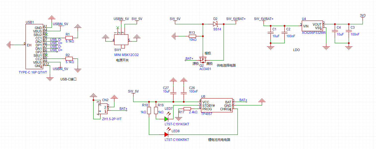 第一次画,越画越蒙 我的问题是: 1.这整个电路是否对,尤其是电池连接那块儿,请帮忙梳理一下电路中的错误; 2.如果要实现: a.接入USB时,不管电源开关是ON还是OFF,电池都充电,开关为ON时,系统才通电(OFF时只给电池充电); b.不接入USB时,开关为ON时系统通电,开关为OFF时,系统断电。#DIY设计##嘉立创PCB##技术干货# 这个电路如何实现