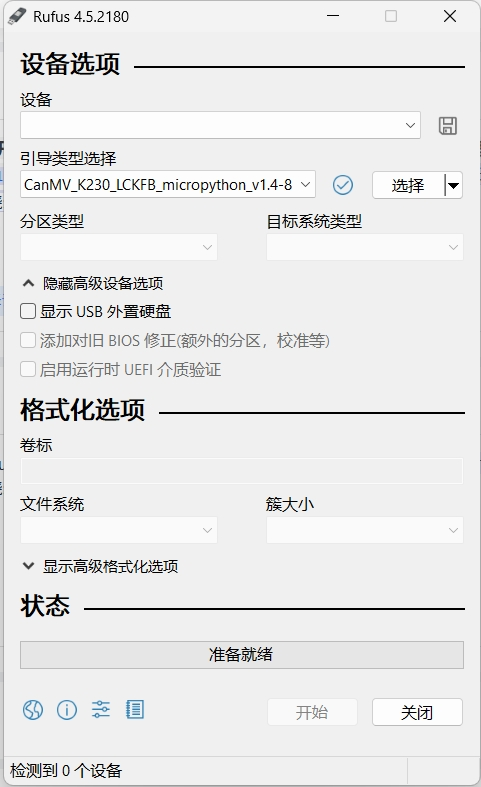 我使用立创·庐山派K230CanMV开发板,在立创文档中获得固件链接 (勘智开发者社区)下载固件CanMV_K230_LCKFB_Micropython_v1.4.0我使用的烧录工具是Rufus 4.5 版本(在W11上进行),将MK(米客方德)的8GTF卡我的烧录工具上无法点击开始按键,无法进行烧录。(电脑能够识别TF卡) 大佬们,小白求助!!!